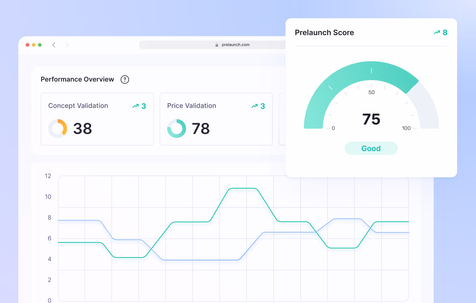 Prelaunch provides a wide range of insights, including price testing, business model evaluation, audience analysis, branding/marketing testing, and more. You can gather quantitative data as well as deeper qualitative insights through surveys, interviews, and focus groups.